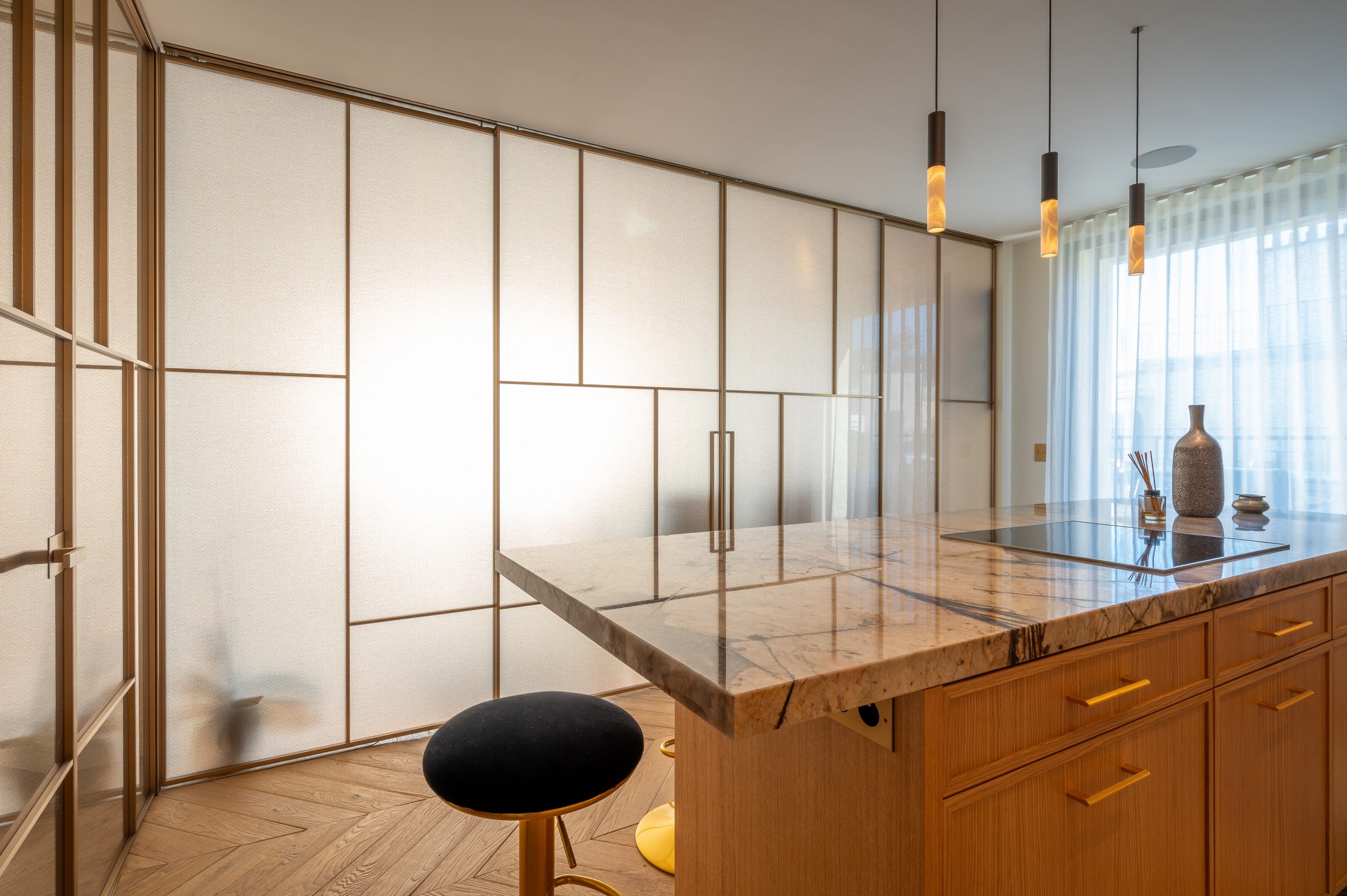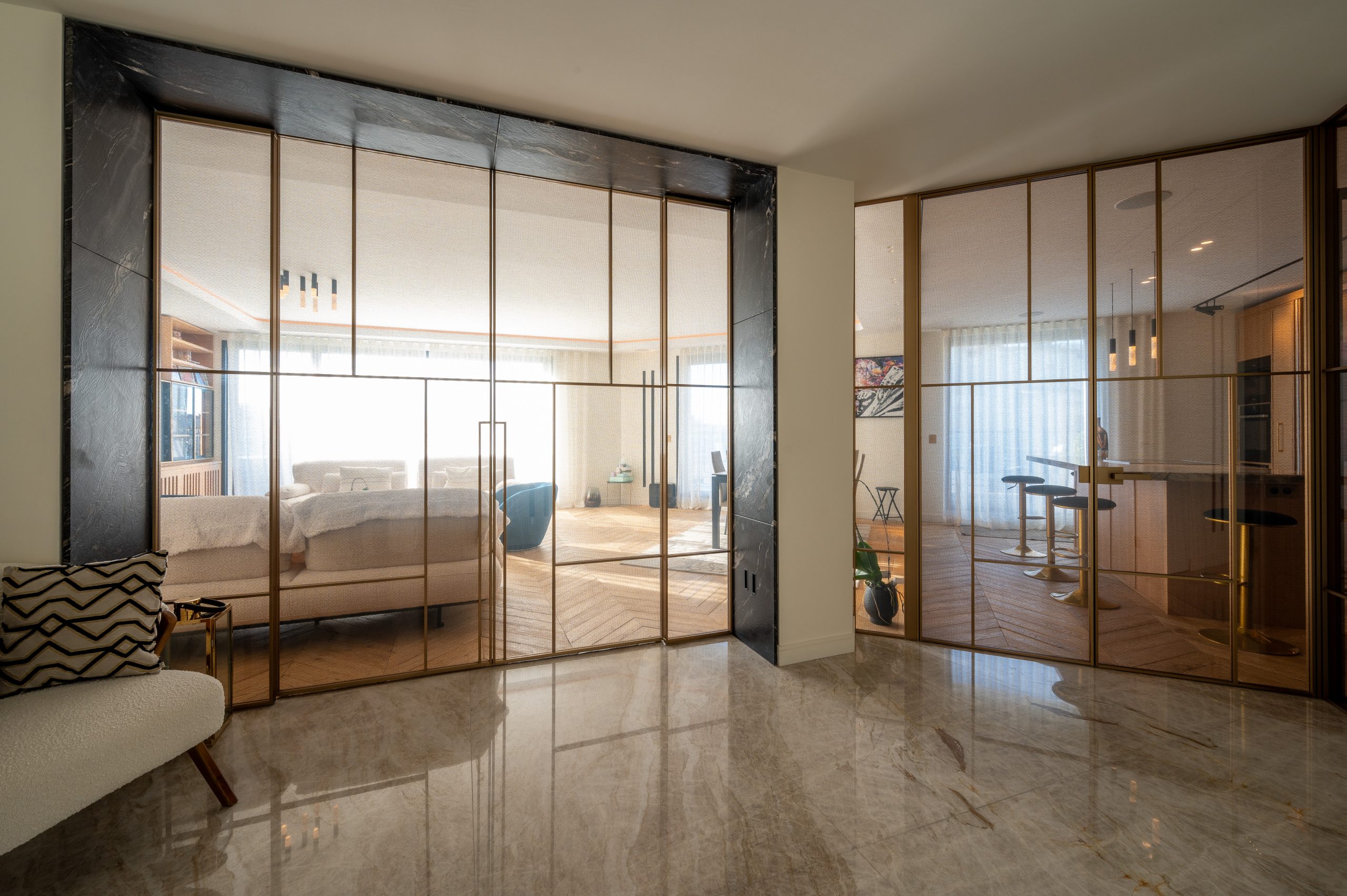 Les portes suivantes, en aluminium laiton et verre, sont enrichies d’un film imprimé effet tissu, dans des versions transparentes ou satinées, ce qui permet de jouer avec la lumière et la transparence tout en ajoutant une touche de raffinement. Ce design subtil met en valeur l’espace tout en apportant de l’élégance et de la fluidité.