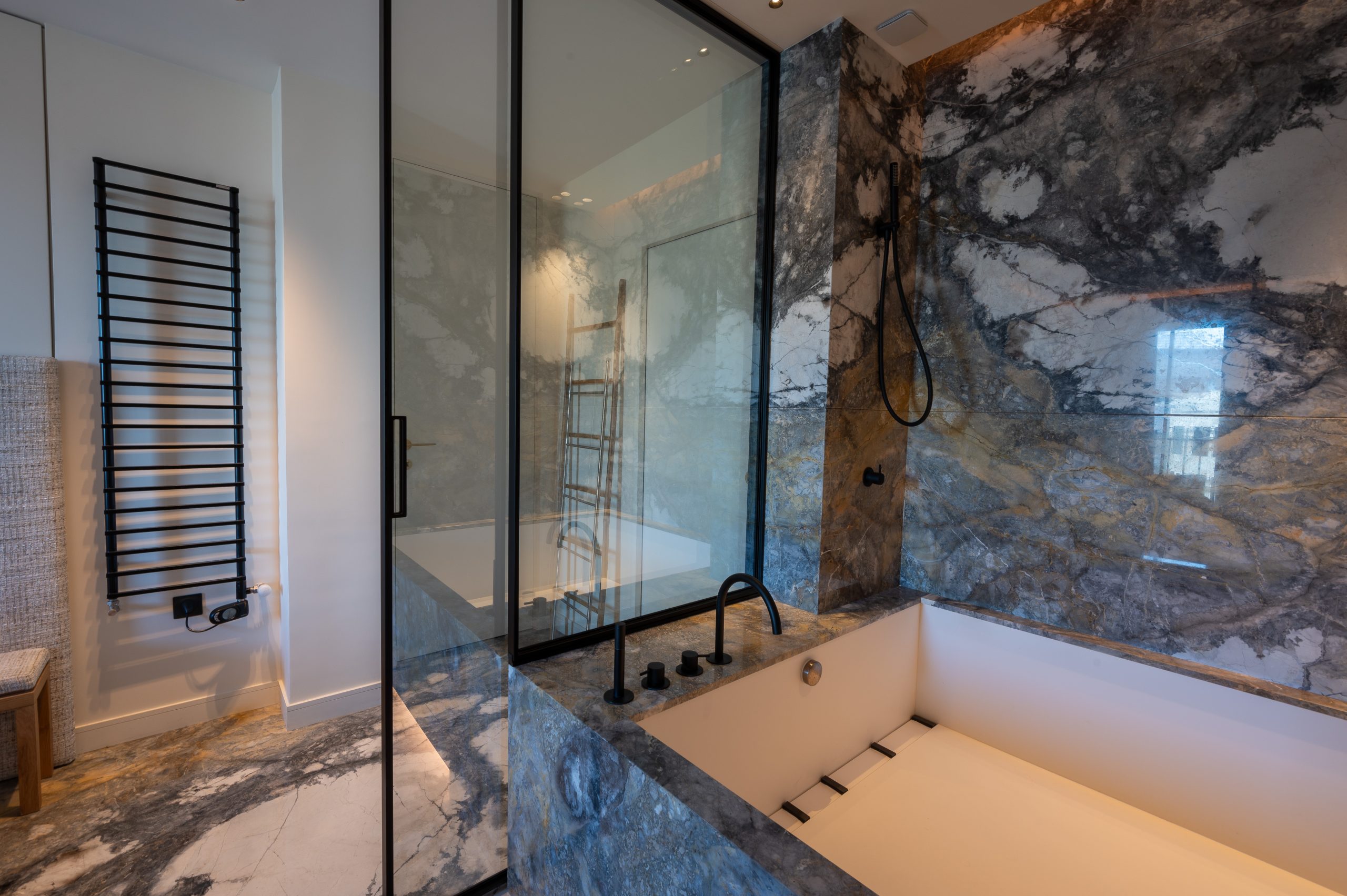 Dans la salle de bain, les portes coulissantes en aluminium anodisé noir et verre transparent réfléchissant créent une atmosphère minimaliste, tout en préservant l’intimité grâce à leur conception astucieuse. Les rails encastrés dans le faux-plafond accentuent le style épuré de l’ensemble et garantissent une expérience visuelle fluide.
